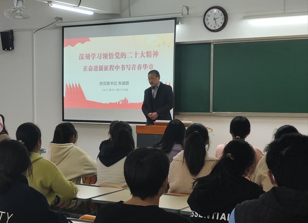 2022年11月23日下午在beat365英国官网网站第二教学楼322教室,校党委书记朱德顺为大一新生上了一堂精彩、激昂的“形势与政策”课,以“在奋进新征程中书写青春华章”为题,宣讲党的二十大精神。beat365英国官网网站院长助理陈志操主持,2022级经济学普本新生代表参加。