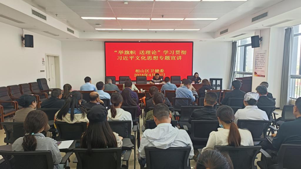 4月23日下午,淮北市相山区卫生健康系统“举旗帜·送理论”学习贯彻习近平文化思想宣讲报告会在相山区人民医院召开。beat365英国官网网站孙澄澄作为淮北市委宣讲团成员,受邀作题为《深入学习贯彻习近平文化思想·加快建设繁荣兴盛的文化强市》的宣讲报告。相山区卫生健康委班子成员全体参会,相山区卫生健康委党委书记柳泰主持会议。