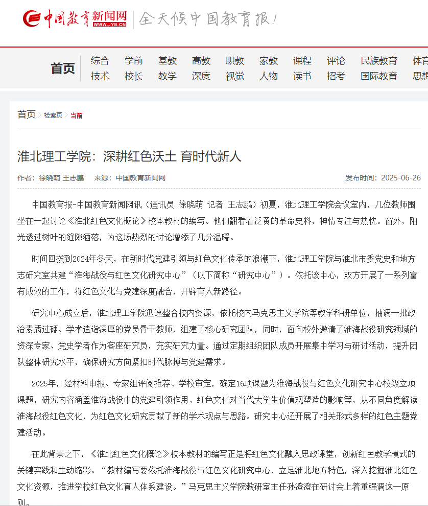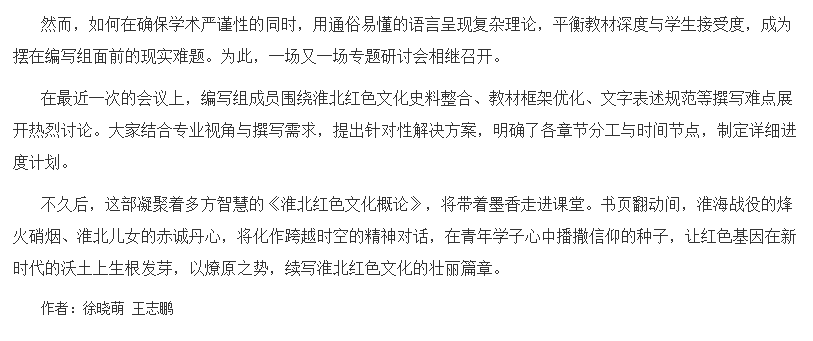 初夏,beat365英国官网网站会议室内,几位教师围坐在一起讨论《淮北红色文化概论》校本教材的编写。他们翻看着泛黄的革命史料,神情专注与热忱。窗外,阳光透过树叶的缝隙洒落,为这场热烈的讨论增添了几分温暖。对此,中国教育报进行了报道: