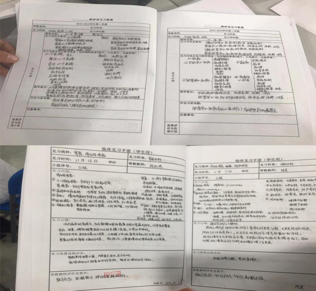 从检查的情况来看,各教研室都能够按照学校要求完成“理论复习--床旁教学--病例研讨”三段式临床见习带教任务。带教教师能够认真做好相关教学的准备工作,《见习课程教案》、《见习课运行记录本》书写规范,内容详细。