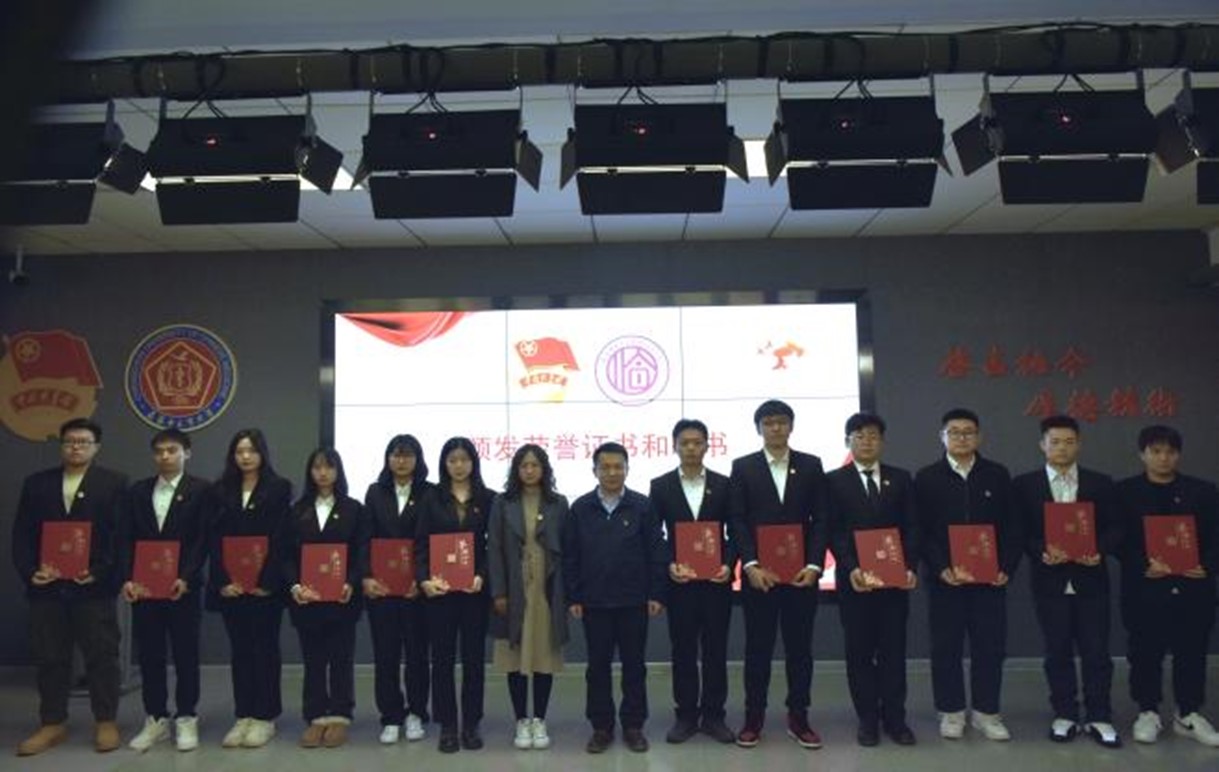 大会第六项议程:学院学生工作办公室副主任兼团委书记马金玉老师和辅导员王荷盈老师为为第六届学生会优秀代表颁发荣誉证书,为第七届学生会学生干部颁发聘书。
