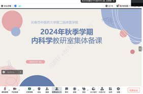 本次集体备课吉林省人民医院、长春市中心医院和吉林省一汽总医院各课程的教研室主任、秘书及授课教师参会,会前充分征求各教学医院关于集体备课的意见和建议。上由各家医院的教研室主任汇报本院秋季学期教学安排,重点关注了课程重点难点及解决措施、学时安排、授课内容及形式教学团队建设等问题,并对床旁见习课安排、学生学习状态及如何在教学中融入职业医师考试知识点等问题进行了深入讨论。